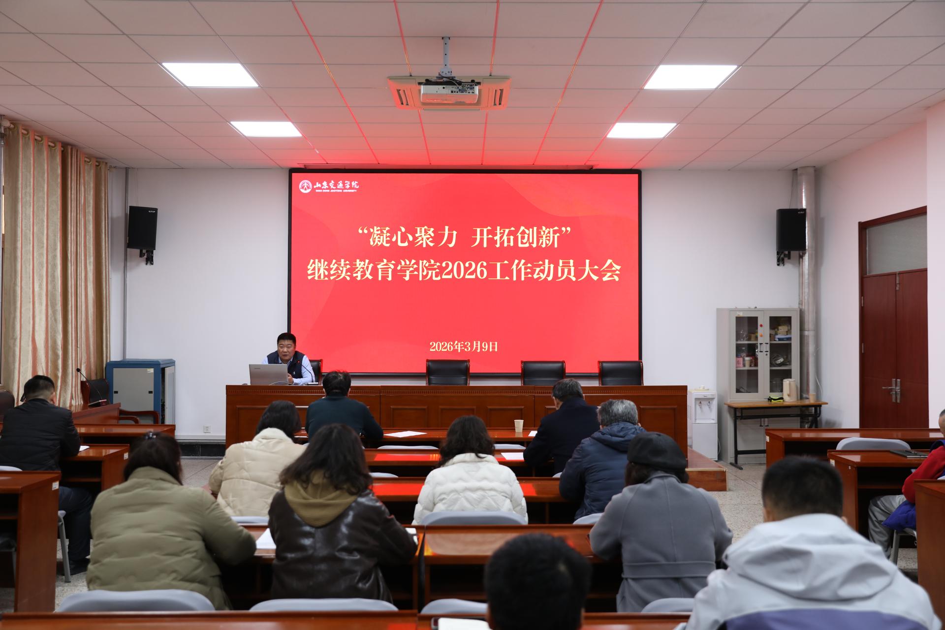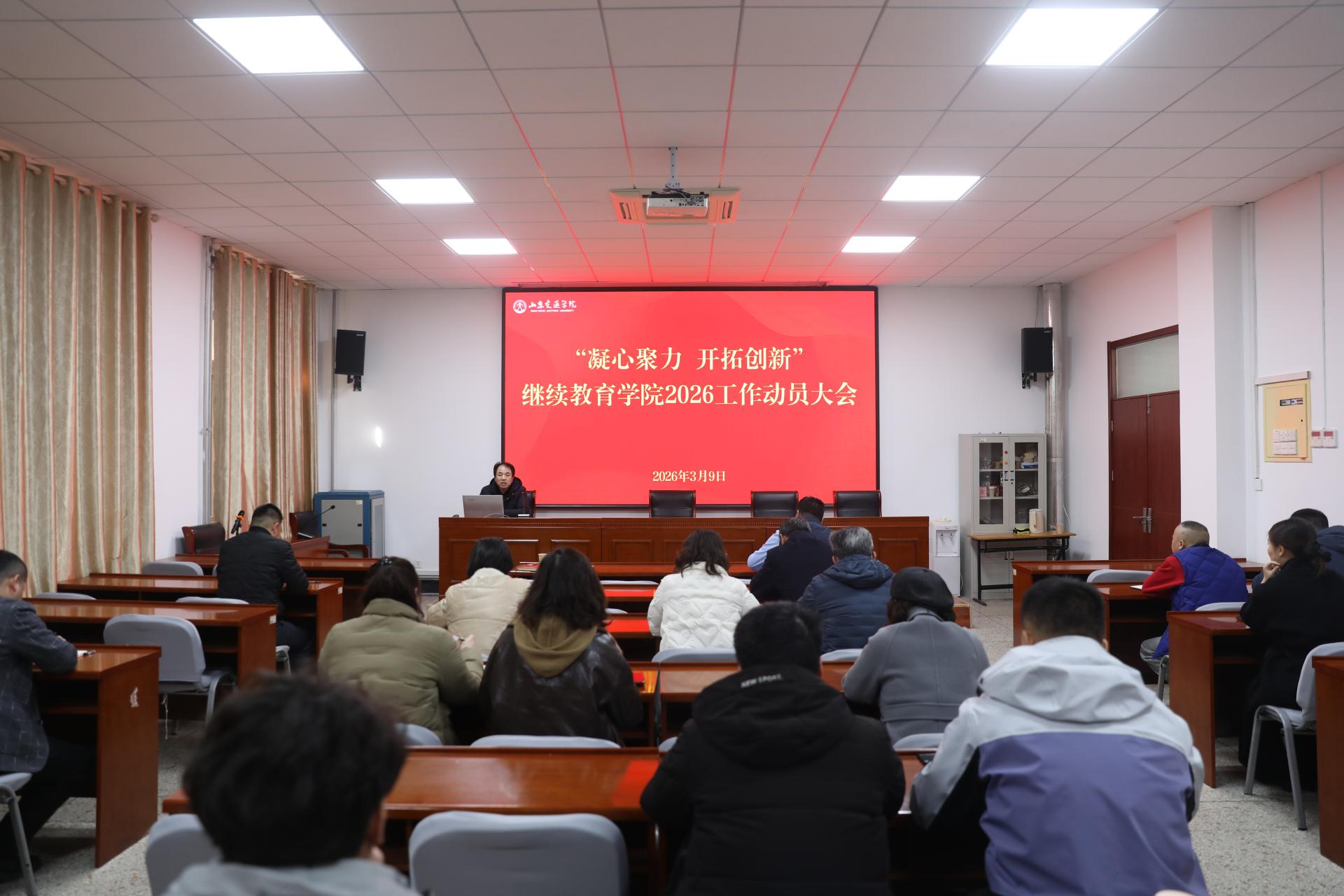 王德利作动员讲话并对2026年度重点工作进行部署。他全面总结了学院2025年的办学成绩和工作成效,深入分析了当前继续教育发展面临的新形势、新挑战,号召全院教职工清醒认识当前面临的困境与时代变革的迫切要求,以“保基础、开新局”为年度工作目标,奋力开启学院高质量发展新局面。他强调,2026年是“十五五”规划的开局之年,也是学院改革创新的关键一年。一是要坚持党建引领,科学谋划发展。各部门要科学编制学院“十五五”规划,谋划未来五年的宏观目标与量化指标,力求“一年起色、三年显成效、五年创品牌”。二是要紧跟政策导向,提升办学水平。根据山东省教育厅关于继续教育的工作要点,按照学校“十五五”规划和2026年学校重点工作,稳定发展本专科层次学历继续教育,规范发展高质量非学历继续教育。三是要多措并举,全力拓展招生渠道,积极开拓非学历培训市场。广泛联系校外教学点,加强与校内二级学院、校办企业联动,创新招生宣传形式;深化校企合作,开展定向招生培养及非学历培训;开拓省外培训市场,拓宽线上非学历培训范围,探索社区教育、老年教育。四是要强化内涵建设,推动高质量发展。加强学院制度建设,扎实做好教学、学籍、学位授予、宣传等日常管理,统筹做好资产管理、后勤保障、70周年校庆筹备等工作,全力推动学院改革创新高质量发展。