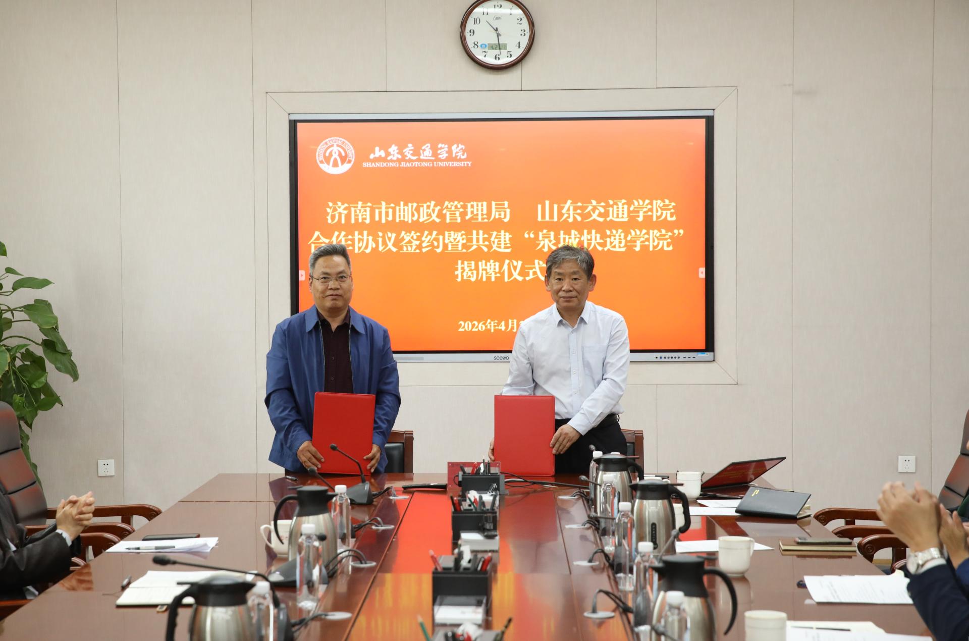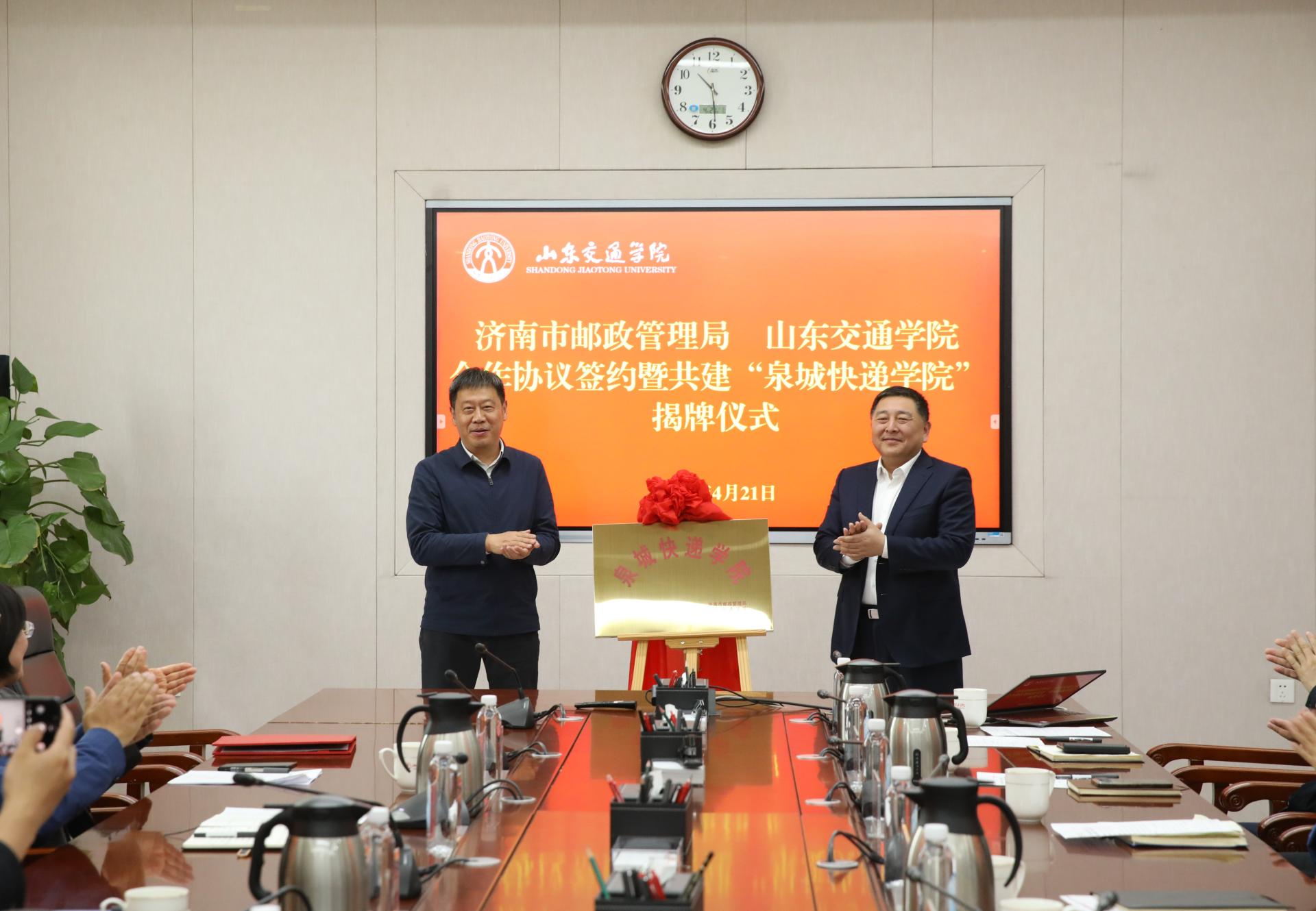4月21日,济南市邮政管理局与山东交通学院合作协议签约暨共建“泉城快递学院”揭牌仪式在长清校区明德楼303会议室举行。济南市邮政管理局党组书记、局长范涛,党组成员、副局长宋克建;学校党委书记王伟,党委委员、副院长王保群,党委委员、副院长张萌萌出席。仪式由张萌萌主持。